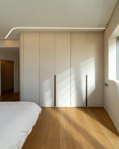 Pe hol, unde un detaliu de iluminat ghidează traseul, finisajul continuă pe pereți și uși, ducând în zona de dormit.