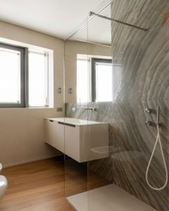 În baie, PerfectCombination își demonstrează versatilitatea tehnică prin placarea nu numai a pereților, ci și a vanității și a căzii, creând un mediu uniform, impermeabil și texturat. Rezistent la umezeală, materialul permite integrarea completă între estetică și funcționalitate, aducând aceeași calitate personalizată băii ca și restului casei.