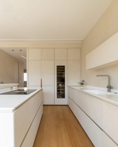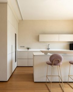 Pe coridor, suprafața se extinde peste pereți, uși și o secvență de dulapuri, conducând înapoi în zona de living. Aici, în bucătărie, PerfectCombination definește dulapurile, insula centrală și masa pentru gustări, contribuind la transformarea spațiului funcțional într-o extensie coerentă a camerei de zi. Continuitatea materială transformă spațiul într-un sistem arhitectural integrat, unde funcția și stilul se întâlnesc într-o sinteză elegantă, minimalistă.